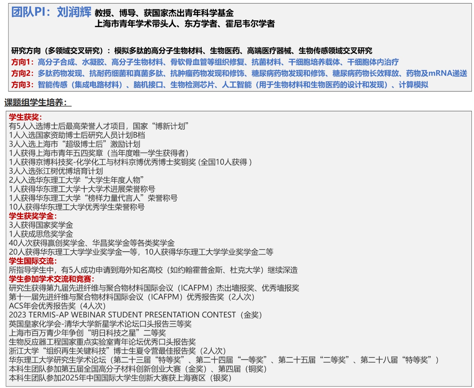 聚焦于生物医药、生物材料领域抗耐药菌感染研究,通过模拟天然多肽,设计发现抗耐药菌非天然骨架聚多肽。以第一/通讯作者在Nature Microbiology、Science Translational Medicine、Nature Communications(2篇)、Angewandte Chemie International Edition(3篇)、Advanced Functional Materials 等期刊发表论文24篇,研究成果多次被国家自然科学基金委收录为基金资助重要成果。申请PCT专利1件、中国专利5件(2件授权)。入选国家“博新计划”和上海市“超级博士后”,获国家自然科学基金青年项目和博士后科学基金面上一等项目的资助。