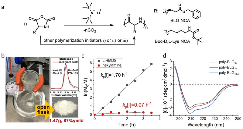 刘润辉教授课题组致力于解决上述NCA聚合核心问题和挑战,建立了Lithium Hexamethyldisilazide(LiHMDS)引发的快速NCA开环聚合,聚合反应在几分钟到几小时即可完成。尤其是,这一聚合方法无需手套箱,可以在普通环境条件下的敞口容器中顺利进行,并制备具有可控二级结构、大分子量(poly-BLG, 1294-mer, Mw=283400 g/mol)、窄分子量分布(Đ=1.08−1.28)的聚肽。机理研究表明,LiHMDS引发NCA聚合为阴离子开环活性聚合,通过拔除NCA环上3-NH活泼氢从而获得NCA负离子引发聚合反应。该活性聚合可以方便地实现NCA均聚、混聚、嵌段聚合,以及所制备聚肽的两端(C端和N端)官能化。这一简单和快速NCA聚合方法突破了传统NCA聚合对手套箱设备的依赖和对溶剂及有机合成技术的要求,可帮助更多非合成背景研究人员制备聚肽并开展各种相关活性和应用研究。这一NCA聚合方法同样适用于平行大量制备聚肽分子库和高通量相关活性、功能筛选研究。
