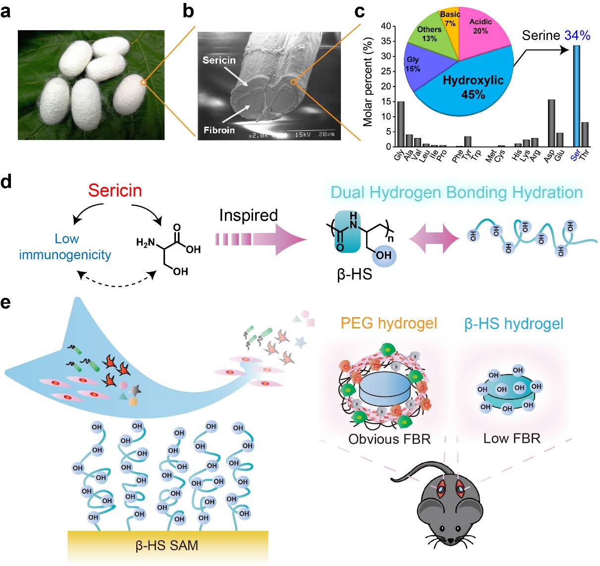 近日,华东理工大学刘润辉教授课题组报道受蚕丝蛋白启发,设计获得了的结构简单、生物相容性好、体内稳定的一类新的抗粘附和抗植入异物反应高分子材料:聚β-丝氨酸。聚β-丝氨酸修饰的表面能够高效抵制多种蛋白吸附、血清污染、细胞、血小板和多种微生物粘附;聚β-丝氨酸水凝胶植入小鼠体内1周到3个月后未发现明显异物反应,明显优于出现显著异物反应的PEG植入对照组。作者首次提出“双重氢键水化”的假设来解释聚β-丝氨酸优异的抗粘附和抗植入异物反应性能,并通过计算模拟加以验证。这类新型抗粘附和抗植入异物反应高分子材料有望用于解决临床中普遍存在的植入材料异物反应难题,在植入材料和装置、药物递送等多个相关领域有广阔的应用前景。