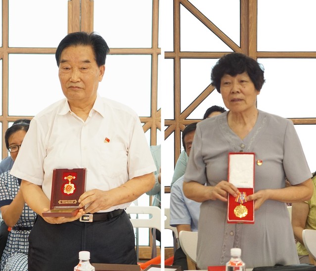 会上,王俊、张启芳老师夫妇还为大家展示了他们获得的两枚极其珍贵的纪念勋章。分别是2019年获得的“庆祝中华人民共和国成立70周年”纪念章和1996年获得的中国航天奖,这两枚奖章是对两位老先生科研工作的最大褒奖。捧着沉甸甸的奖章,两位老教师动情地表示“为国、为党奋斗,祖国不会忘记,人民不会忘记你”。