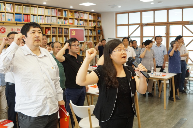 交流分享后,全体教师在袁媛的领誓下重温入党誓词,铭记自己永远的政治身份。