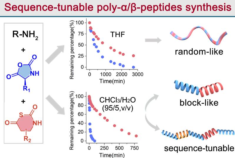 本研究着眼于解决多肽模拟物对酶降解可调和聚合物序列可控的关键性需求和挑战。通过α-NCAβ-NTA共聚实现了α/β-多肽的可控合成和对蛋白酶降解的调节;通过共聚反应中溶剂对单体聚合速率的调节作用,实现了α/β-多肽的序列可控合成。这一方法制备的α/β-多肽可通过改变氨基酸的序列和比例来调节蛋白酶稳定性和功能,作为一种降解可调节的多肽模拟物以适配不同应用场景。同时,这类α/β-多肽的合成方法在对蛋白质和多肽的折叠结构探索中具有潜在的重要意义。