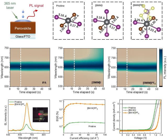 针对这一关键问题,研究团队利用密度泛函理论深入探究宽带隙卤化物组分与各个官能团的配位及反应机制,进而利用[BMIM]PF6离子液体创新性地实现了铯铅卤钙钛矿表面缺陷结构的等化学计量比刻蚀,创制出表面包埋缺陷结构与不饱和表面位点协同钝化的钙钛矿薄膜。该薄膜表层附近结构不但具有良好的取向与晶格连续性,而且表面吸附的离子液体能够与铅、卤素等缺陷位点键合,从而有效改善钙钛矿吸光材料的缺陷态密度和载流子传输效率。表面处理后,宽带隙(1.88 eV)铯铅卤钙钛矿电池的非辐射复合电压损失由0.33 V降低至0.19 V,器件的光电转换效率由14.31%提升至17.51%,达到了同类钙钛矿电池的最优水平。上述研究有望应用到其他类型钙钛矿材料中,为光伏电池性能及寿命提升提供了新的研究思路。