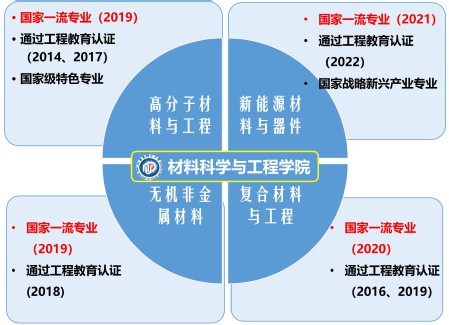 发挥专业特色和优势,积极开展专业建设。2019年,学院的“高分子材料与工程”专业和“ 无机非金属材料”专业首批被认定为国家一流本科专业;2020年,“复合材料与工程”专业在第二批次被认定为国家一流本科专业;2021年,“新能源材料与器件专业”于第三批次入选国家一流本科专业。