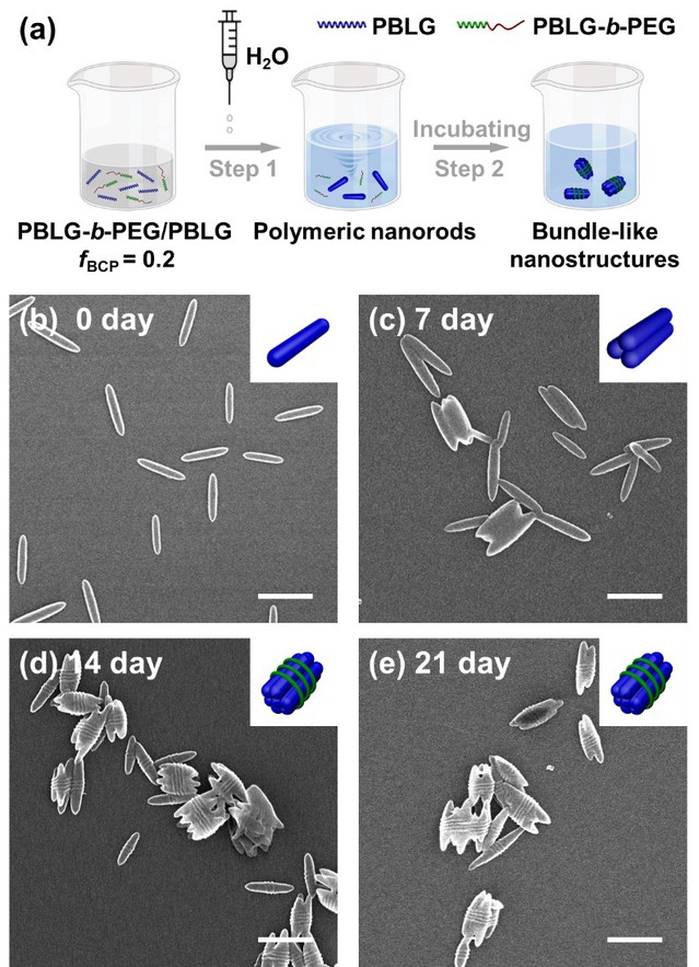 林嘉平教授团队报道了嵌段共聚物介导的聚合物纳米棒超分子聚合。在聚合物纳米棒水溶液中,加入嵌段共聚物第二组分,可以调控超分子反应,发生新颖的“肩并肩”并排聚合现象,并形成独特的捆绑束状多级结构。疏水刚性的聚(γ-苄基L-谷氨酸酯)(PBLG)均聚物在含水的有机溶剂中自组装形成纳米棒,PBLG的主链与纳米棒的长轴方向平行;由于其表面的疏水性,纳米棒发生无序聚集,形成不规则的结构。当体系中加入聚(γ-苄基L-谷氨酸酯)-嵌段-聚乙二醇(PBLG-b-PEG)嵌段共聚物时,纳米棒仍能形成,但是其无序聚集行为被抑制;通过静置培养,纳米棒“肩并肩”聚合形成束状有序结构。随着束状聚集体的形成,嵌段共聚物在其表面逐渐组装形成纳米螺纹,纳米棒的聚合终止,最终得到捆绑束状多级结构的聚合产物。