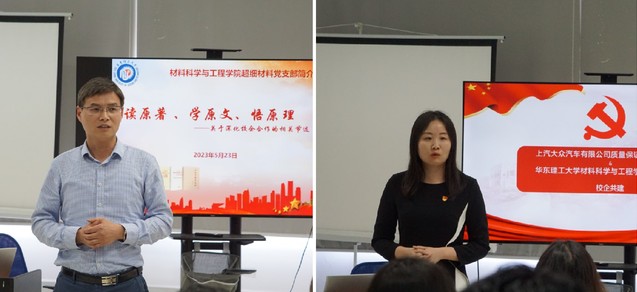 超细实验室党支部书记张玲围绕《习近平新时代中国特色社会主义思想专题摘编》中关于科技自立自强、深化校企合作的原文进行了领学,从党支部架构、人员组成、主要科研方向、汽车行业的特色研究工作等方面介绍了党支部概况,她表示,希望通过合作共建,合力推动开辟新领域新赛道。