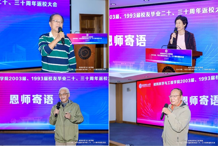 班导师和辅导员陪伴学生度过了四个春夏秋冬,是学生的良师益友,一句话、一件事都会给学生留下难忘的记忆。在恩师寄语环节,陈国荣、席士英、徐佩弦、朱源泰老师分别分享了与学生一起并肩成长的故事,勉励校友们要时常挂念母校,发挥自身优势,为学校、学院发展建言献策,在各自人生发展路途中,保持初心,有困惑、有不解,欢迎随时回到母校,和师友畅谈交流。校友们看到老师亲切的面孔,听到熟悉的声音,感慨万千。