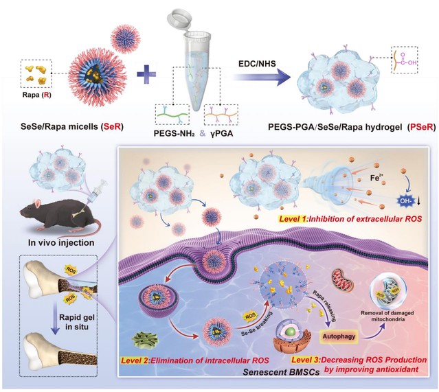 刘昌胜院士,袁媛教授和张琰教授课题组报道了一种负载含雷帕霉素的聚二硒化物胶束的可注射聚乙二醇化甘油癸二酸酯/聚谷氨酸水凝胶(PEGS-PGA/SeSe/Rapa,PSeR),用于多维度调控老龄骨再生微环境的活性氧(ROS)水平,恢复老龄骨组织的再生潜能。这一研究成果以题为“Rejuvenating aged bone repair through multihierarchy reaction oxygen species-regulated hydrogel”发表在Advanced Materials上。