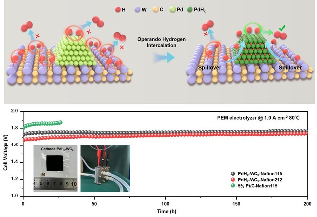 研究团队创新性地开发了一种工况稳定、低贵金属载量负载在WCx上的PdHx纳米团簇析氢电催化剂材料(PdHx-WCx)。这种新型催化材料体系,利用了贵金属Pd在电化学还原电位下原位注氢形成PdHx的特点,有效调节了Pd反应位点的氢吸附能,诱导了反向氢溢流过程,即吸附氢原子从WCx载体(强氢结合能)溢流到PdHx位点(弱氢结合能)进行反应,进而加速了析氢反应动力学。所形成的PdHx-WCx材料在制氢工况环境下结构稳定,在三电极测试体系中达到10 mA cm-2电流密度时仅需28 mV的低过电位,在50 mV的过电位下具有11.375 A mgPd-1的高质量活性,相比与商用的Pt/C(20wt%)提高了7.9倍。进一步将该电催化剂材料应用于PEMWE电解槽的阴极,Pd贵金属负载量仅为0.022 mg cm-2,器件达到1 A cm-2电流密度时的电压为1.66 V,并且连续运行200 h无明显的性能衰减。与目前商业化PEMWE电解槽阴极水平相比(0.4 ~ 1.0 mgPt cm-2),本工作构建的器件贵金属负载量可降低至少94.5%,且不会明显影响制氢器件的性能和稳定性。