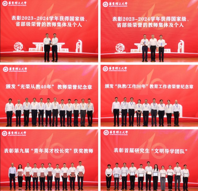 大会隆重表彰了2023-2024学年获国家级、省部级奖励的教师集体和个人。我院上海市先进聚合物材料重点实验室获2024年全国工人先锋号;侯宇入选2024“强国青年科学家”引领计划;侯锐钢、周权等荣获2023年度中国石油与化学工业联合会技术发明三等奖;庄启昕荣获2023年全国石油和化工教育教学名师(本科院校);靳海宝荣获第九届“青年英才校长奖”优秀奖;AI plus高分子材料导学团队获评首届研究生“文明导学团队”。唐颂超、汪济奎、朱以华作为“从教40年”教师上台接受荣誉纪念章;陈涛作为“执教、工作30年”教育工作者代表上台接受荣誉纪念章。