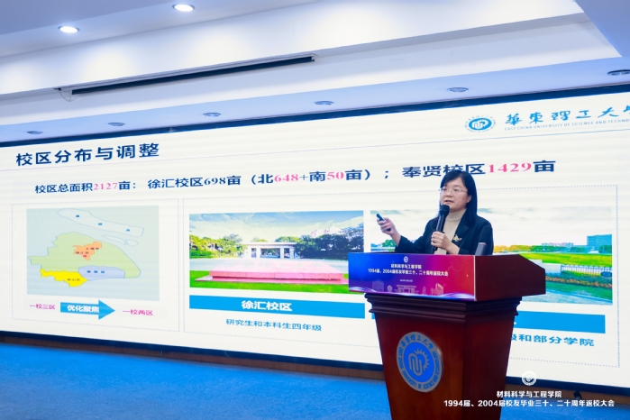 袁媛代表全院师生对校友返校表示热烈欢迎,对校友们一直以来对学院发展的关心与支持表示感谢。她从学科建设、人才队伍、科研基地、重点建设方向、学生培养、先进材料大楼建设、校企合作、校友活动等方面介绍了学院发展现状。她谈到,因为今年自己也刚好毕业30周年,特别能体会大家的心情,虽然身处各行各业,但都有同一个身份“华理人,华理是大家最初梦想的起点。希望大家共同打造“华理生命共同体”,校友之间、校友与学校、学院之间加强沟通交流,互助互补,齐心携手,同心筑梦,共筑“材料梦”、共筑“华理梦”、共筑“中国梦”。她向校友们表达了衷心的祝福,欢迎大家常回家看看。