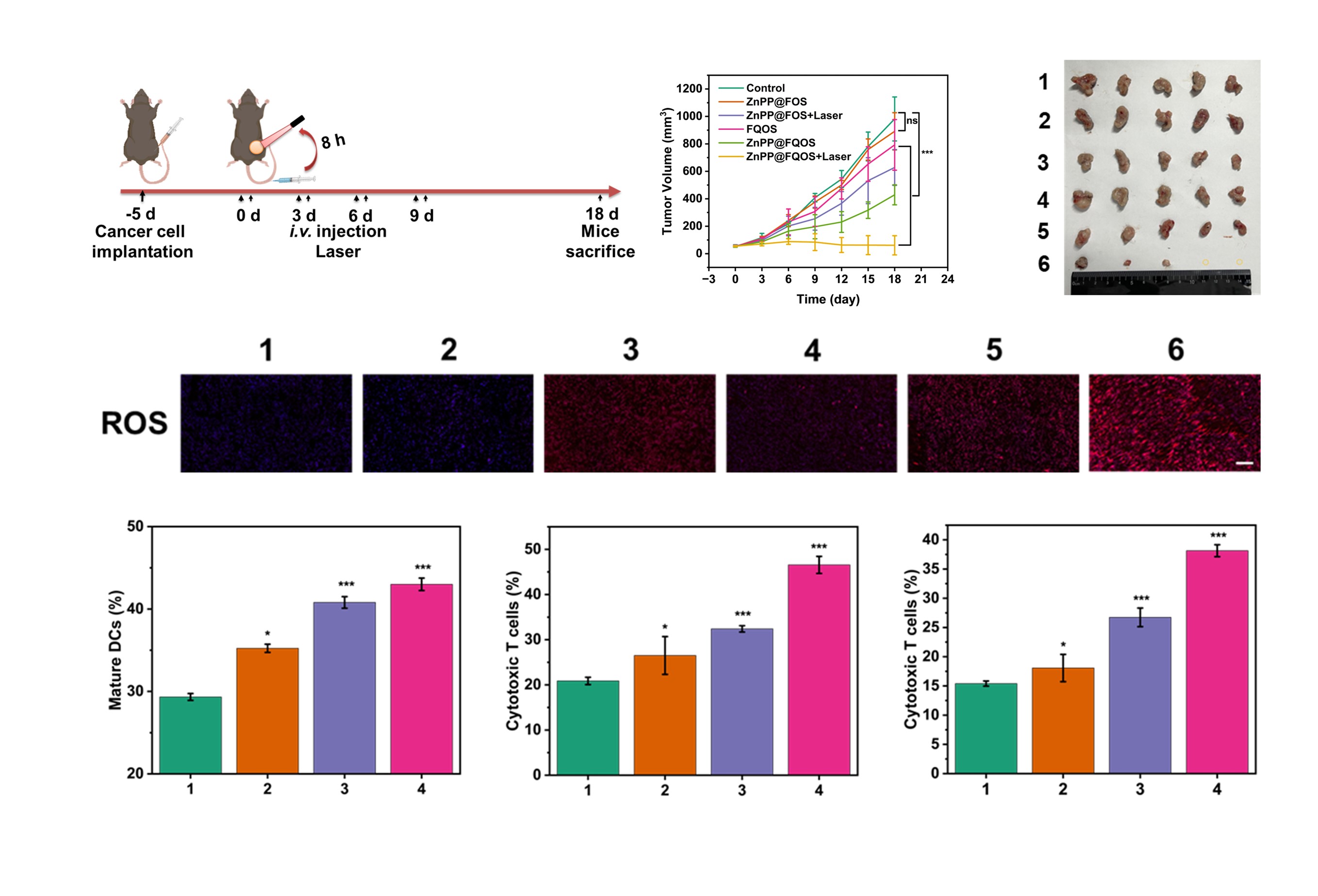 通过建立荷瘤小鼠模型,研究团队系统探究了ZnPP@FQOS的抑瘤效果及免疫应答激活能力(图3)。基于KP肺癌皮下瘤模型发现其具有显著的抑瘤效果,抑瘤率达到了92.9%;通过对肿瘤内的ROS进行染色成功地在活体层面证明了内、外源“多管齐下”ROS调控策略的成功实现。其次构建了Pan02胰腺癌双侧肿瘤模型进一步验证ZnPP@FQOS联合免疫检查点阻断疗法后的全身性免疫激活效果。结果表明,ZnPP@FQOS治疗后脾脏中的成熟树突状细胞数量得到显著提升,并且原发及远端肿瘤经纳米药物治疗后的细胞毒性T细胞数量均大幅增加,说明其成功激活了小鼠的全身性免疫反应,扭转了胰腺癌的严重抑制免疫微环境。该工作将为设计和精准构建以ROS调控为基础的纳米药物从而实现安全高效的肿瘤治疗提供了新思路。