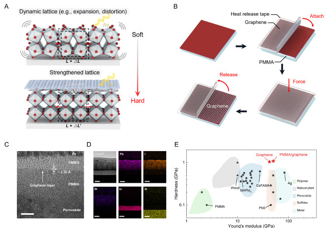 石墨烯具有超高模量(约1 TPa),是钙钛矿材料模量的50~100倍,且具有均匀致密、耐机械疲劳和化学稳定的优点。有没有可能借用石墨烯这个外援,来提升钙钛矿的稳定性呢?然而,石墨烯与钙钛矿并不兼容,如何实现是一大难题。