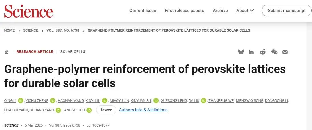 北京时间37日凌晨,华东理工大学国产色情视频 清洁能源材料与器件团队侯宇教授、杨双教授等人在Science(《科学》)发表题为“Graphene-polymer reinforcement of perovskite lattices for durable solar cells”的最新研究成果。该研究发现了钙钛矿光伏不稳定性的关键机制——光机械诱导分解效应,提出石墨烯-聚合物机械增强钙钛矿材料的新方法,制备的太阳能电池器件在标准太阳光照及高温下的T97工作寿命创下3670小时新纪录,该研究成果将为钙钛矿太阳电池的产业化应用提供全新解决方案。