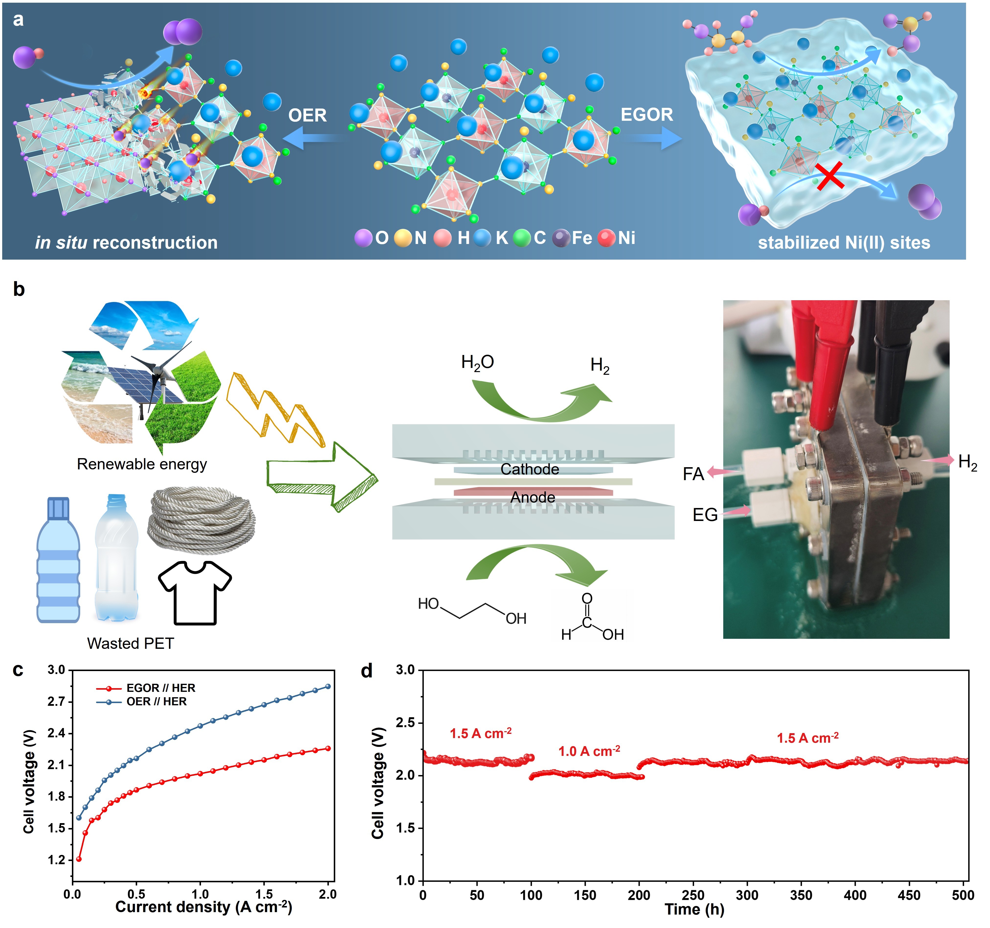 清洁能源材料与器件团队在普鲁士蓝类似物(NiFe-sc-PBA)体系中发现独特的低价Ni(II)活性位点,可以实现稳定、高效、高选择性的乙二醇氧化(EGOR)过程。系列原位/非原位表征结合理论计算证明了Ni(II)位点在EGOR反应过程中的稳定性,即无需重构形成高价NiOOH活性物质便可以发生高选择性EGOR催化过程。分子动力学模拟进一步表明了“催化剂-反应物相互作用关系”在醇类氧化中的重要性:EG分子倾向于聚集在NiFe-sc-PBA表面,重塑的氢键网络阻止电解质中羟基的吸附氧,从而有效避免碱性溶液中羟基诱导的结构重构。所设计的Ni(II)活性中心在EGOR反应中展现出了优异的催化活性,在500和1000 mA cm⁻2的电流密度下,EGOR电位仅为1.484和1.625 V。为了进一步探究催化剂的实际应用潜力,对催化剂进行了膜电极器件组装,EGOR//HER体系相比与OER//HER体系显著降低了输入电压,在宽运行电流密度范围内(0.2到1.8 A cm-2)实现高甲酸法拉第效率(>90%)。组装的耦合制氢系统在1.0或1.5 A cm-2的电流密度下稳定运行了500小时,没有出现明显的性能衰减。本研究工作不仅为催化剂/反应物界面相互作用提供了全新的理解,也为设计高效、稳定的有机亲核小分子电氧化催化材料提供了重要借鉴。