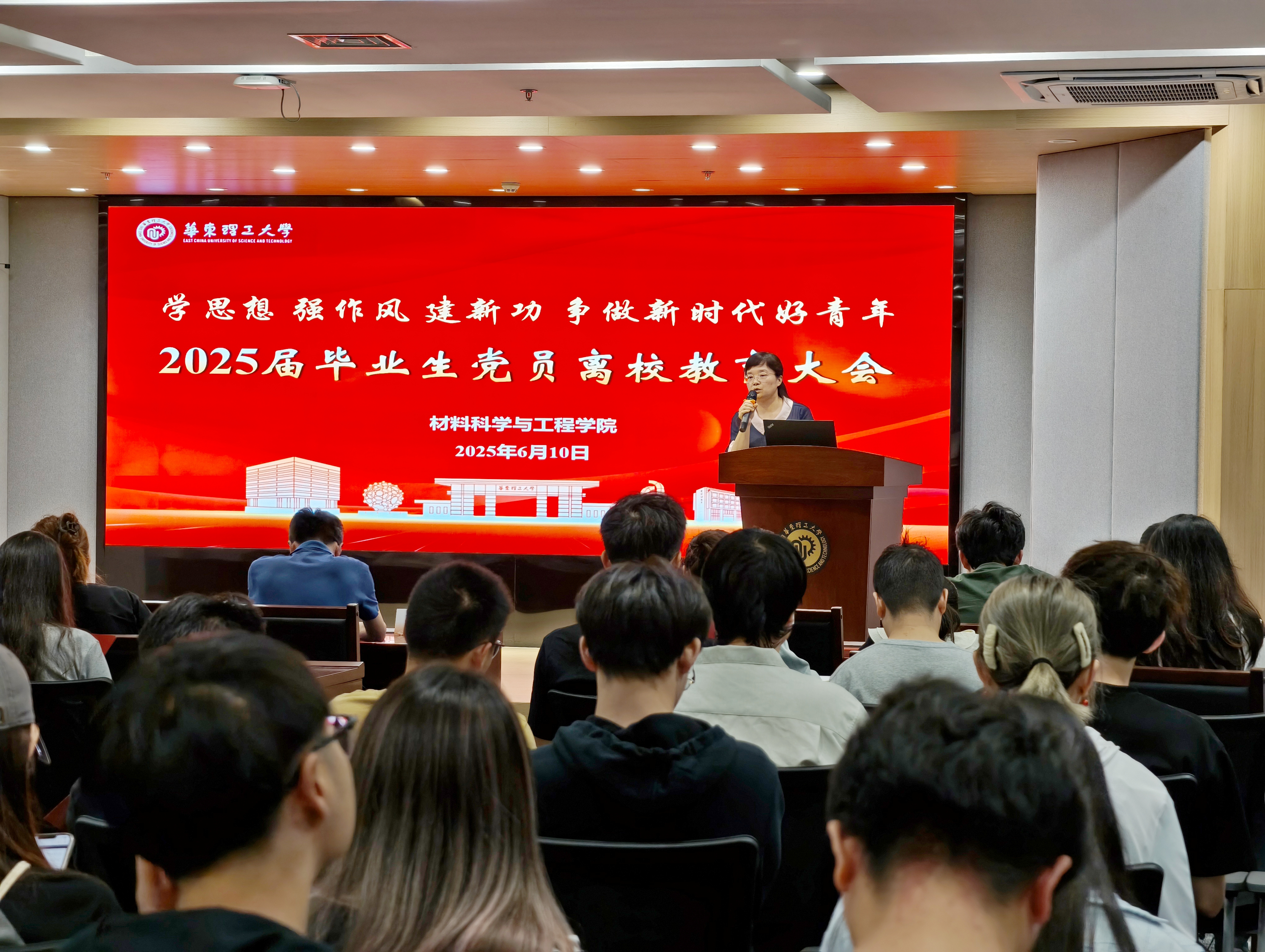 在徐汇校区先进材料大楼526会议室召开2025届毕业生党员离校教育大会。学院党委书记袁媛、党委副书记兼纪委书记苏建玲、党委副书记戴诚安、专职组织员、辅导员及全体毕业生党员参会。会议由戴诚安主持。