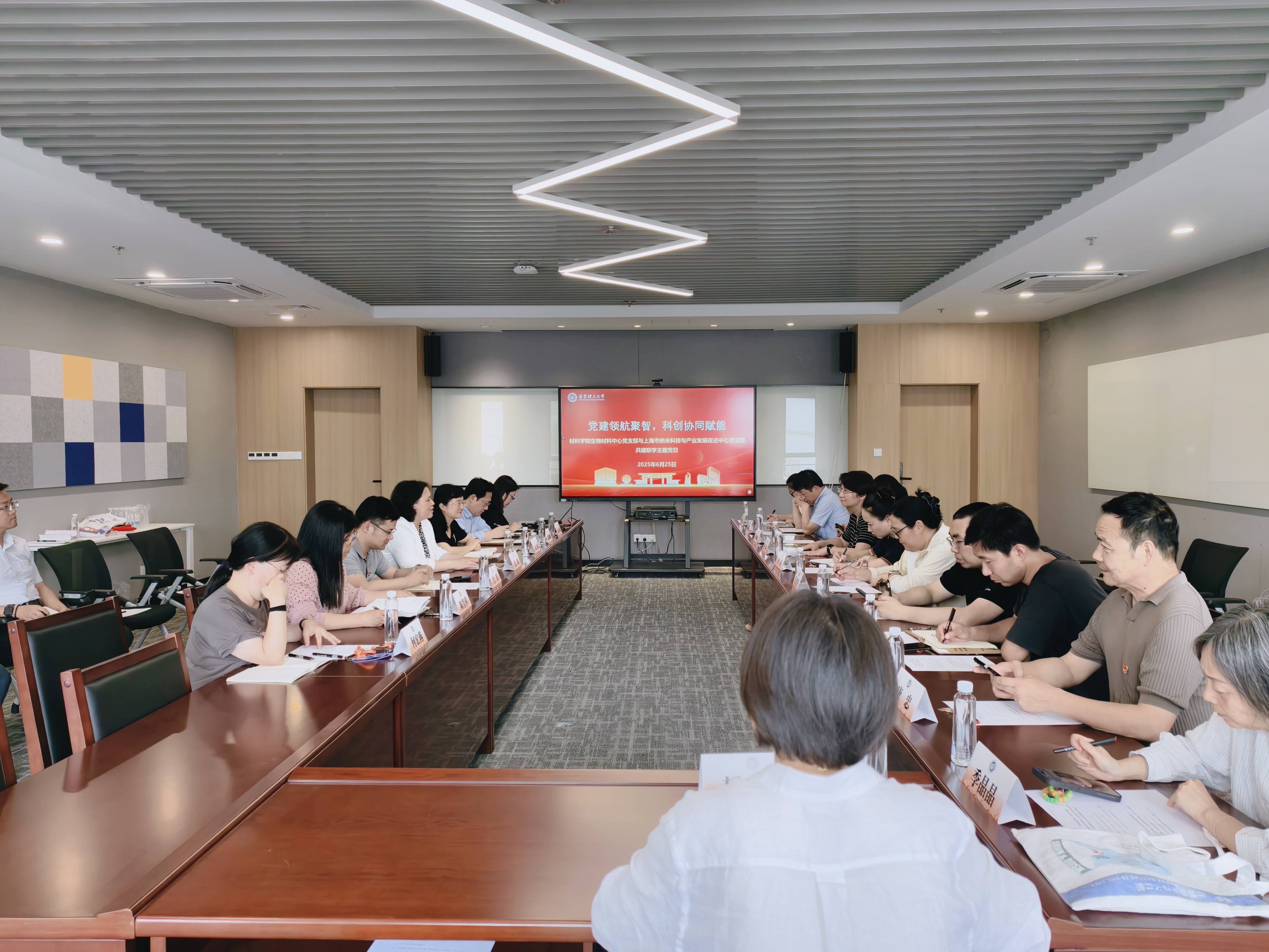 生物材料中心党支部与上海市纳米科技与产业发展促进中心党支部在先进材料大楼524会议室开展“党建领航聚智,科创协同赋能”共建联学主题党日观摩活动。后勤保障处、药学院、卓越工程师学院等党员代表到现场观摩。活动由生物材料中心党支部书记张琰主持。