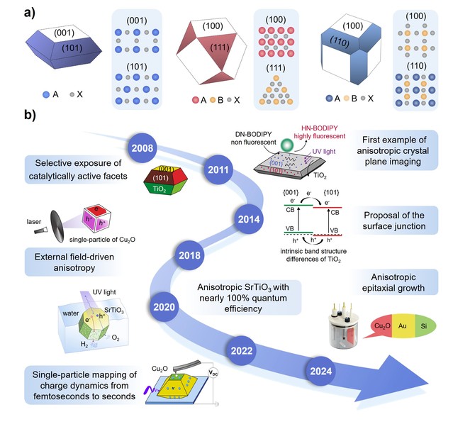 图1 a) 各向异性晶体结构和表面原子排列示意图。b) 各向异性半导体光(电)催化剂的发展历程和重要研究成果。